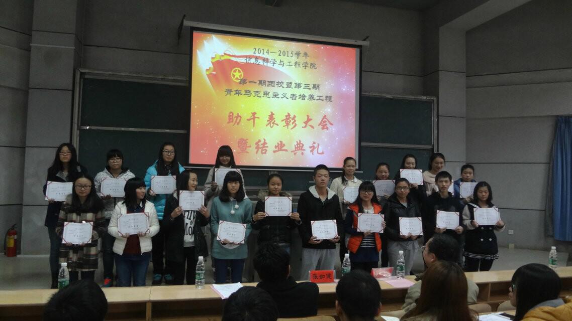 (通訊員 丁青 肖亞麗 易利) 2014年11月25日12點(diǎn)30分,信息科學(xué)與工程學(xué)院第一期團(tuán)校暨第三期青年馬克思主義培養(yǎng)工程助干表彰大會(huì)暨結(jié)業(yè)典禮于理科樓報(bào)告廳(一)隆重舉行。信工院黨總支書記王杰文、院黨總支副書記張如健應(yīng)邀出席本次結(jié)業(yè)典禮,2014-2015屆學(xué)生干部代表以及100余名助理干事參加了本次典禮。本次典禮由團(tuán)總支書記易利主持。