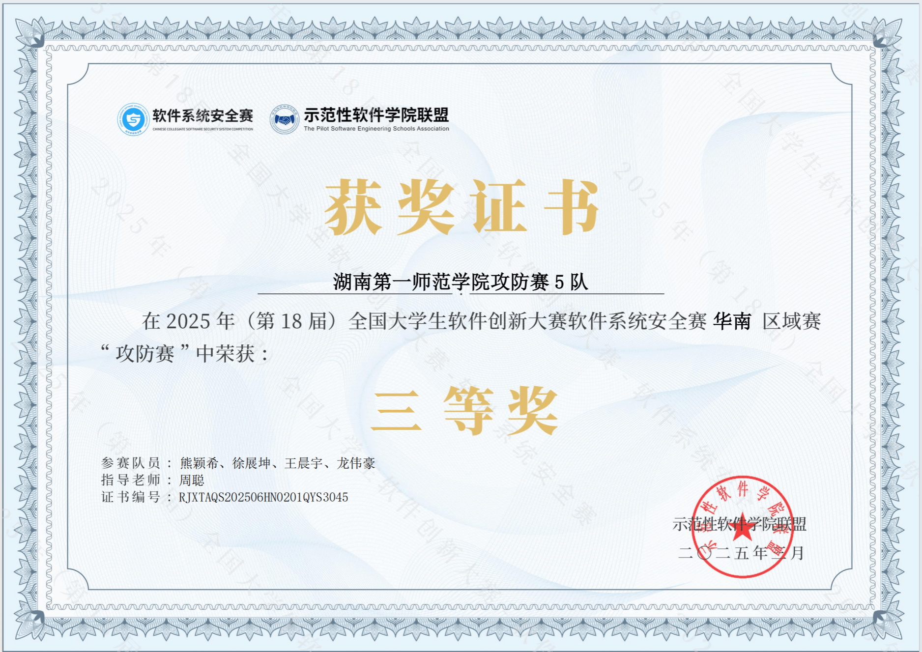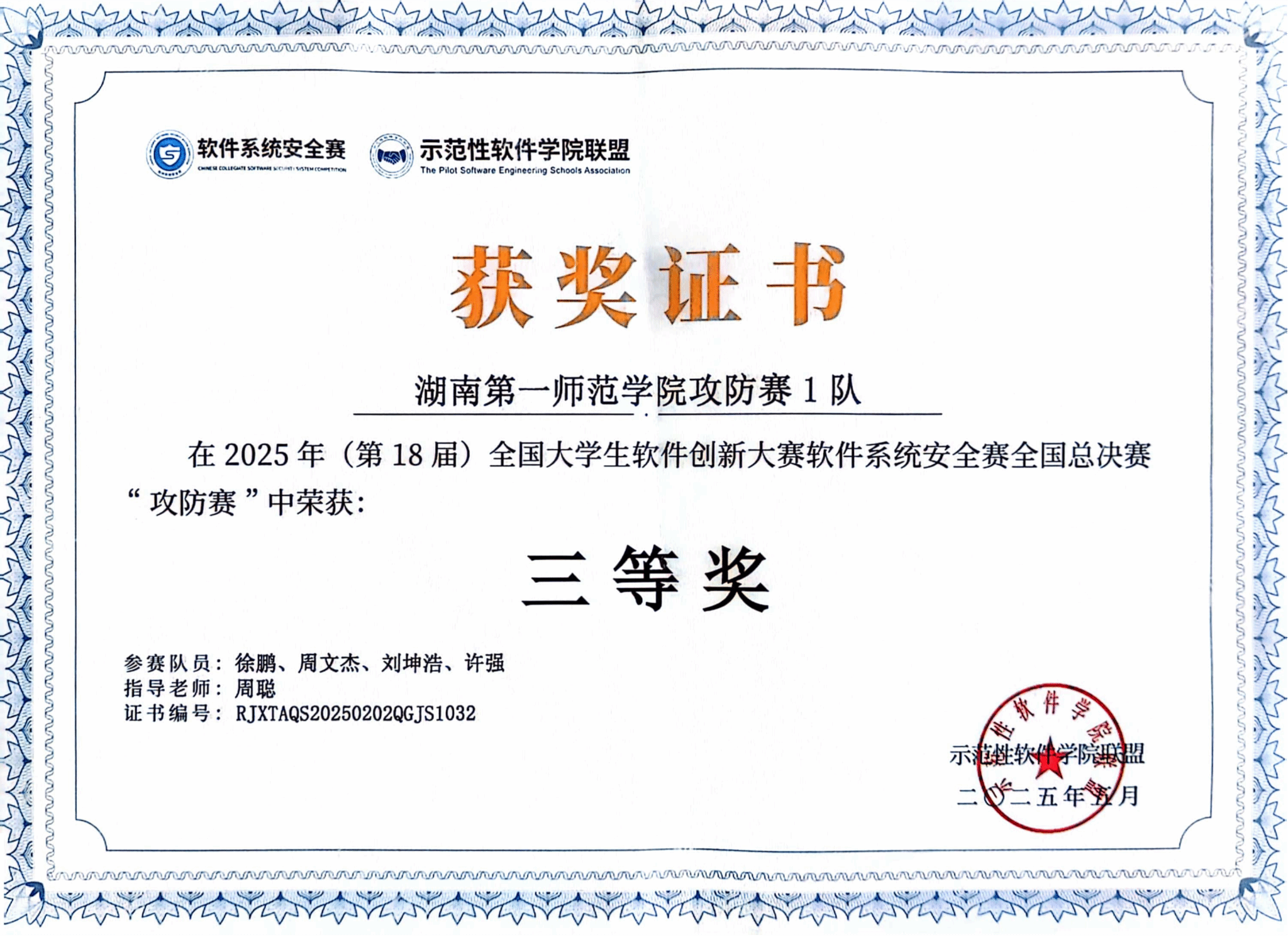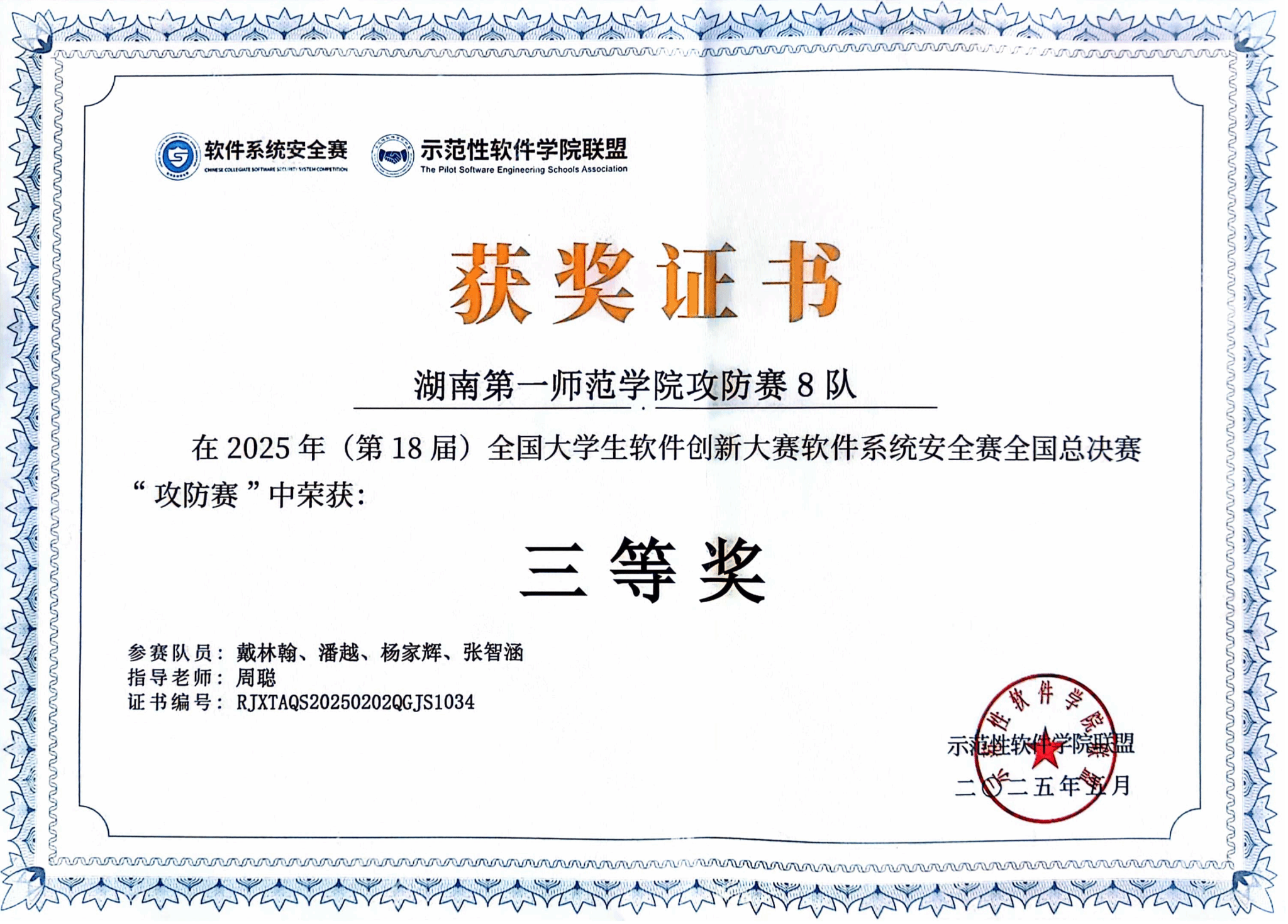 第18屆全國(guó)大學(xué)生軟件創(chuàng)新大賽軟件系統(tǒng)安全賽全國(guó)總決賽于2025年5月18日在湖南大學(xué)圓滿落幕。湖南高校共有18支團(tuán)隊(duì)獲獎(jiǎng)。其中我院的2支參賽團(tuán)隊(duì)榮獲攻防賽三等獎(jiǎng),實(shí)現(xiàn)了網(wǎng)安競(jìng)賽團(tuán)隊(duì)在國(guó)家級(jí)賽事中獲獎(jiǎng)的突破。在區(qū)域賽階段,我院參賽團(tuán)隊(duì)表現(xiàn)出色,斬獲一等獎(jiǎng)2項(xiàng)、二等獎(jiǎng)1項(xiàng)、三等獎(jiǎng)3項(xiàng),位居華南賽區(qū)前列。