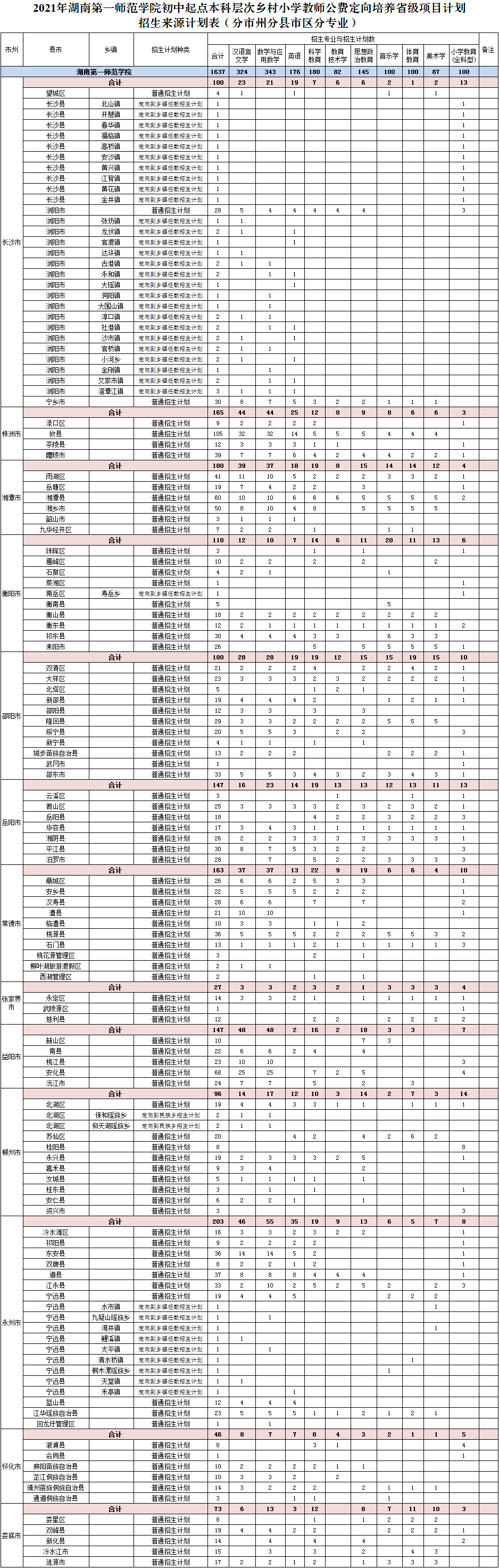 附件2 2021年湖南第一師范學院初中起點本科層次鄉(xiāng)村小學教師公費定向培養(yǎng)省級項目計劃招生來源計劃表(分市州分縣市區(qū)分專業(yè)).png