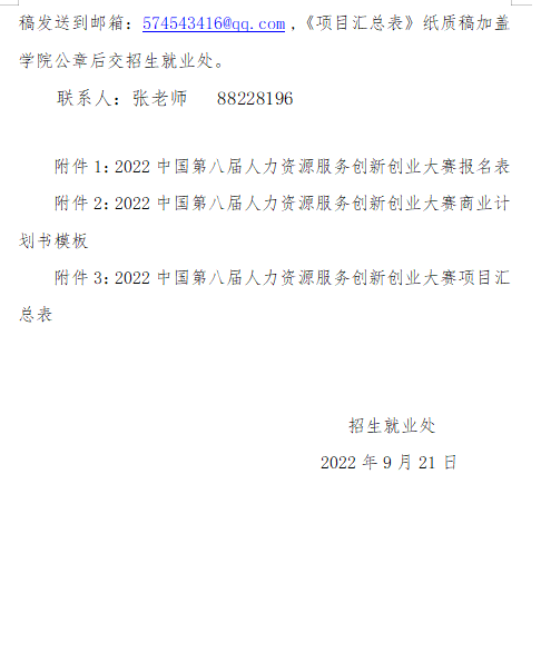 現(xiàn)將校創(chuàng)新創(chuàng)業(yè)學(xué)院《關(guān)于組織我校學(xué)生參加2022年第八屆中國(guó)人力資源服務(wù)創(chuàng)新創(chuàng)業(yè)大賽的通知》轉(zhuǎn)發(fā),請(qǐng)按照文件要求,廣泛宣傳,積極動(dòng)員學(xué)生參加大賽,具體參賽要求見附件?。請(qǐng)各班實(shí)踐委員于9月27日下午18:00前將推報(bào)材料(見附件1)紙質(zhì)版、電子版以班級(jí)名稱命名上交院創(chuàng)新創(chuàng)業(yè)與就業(yè)服務(wù)部楊同學(xué)(QQ:2084222961)。院創(chuàng)新創(chuàng)業(yè)與就業(yè)服務(wù)部于次日交至學(xué)院學(xué)工辦(百熙樓127-5)。
