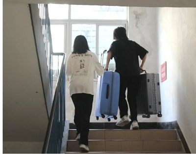 圖為迎新志愿者引導新生上校園擺渡車,幫助新生搬運行李箱送至寢室