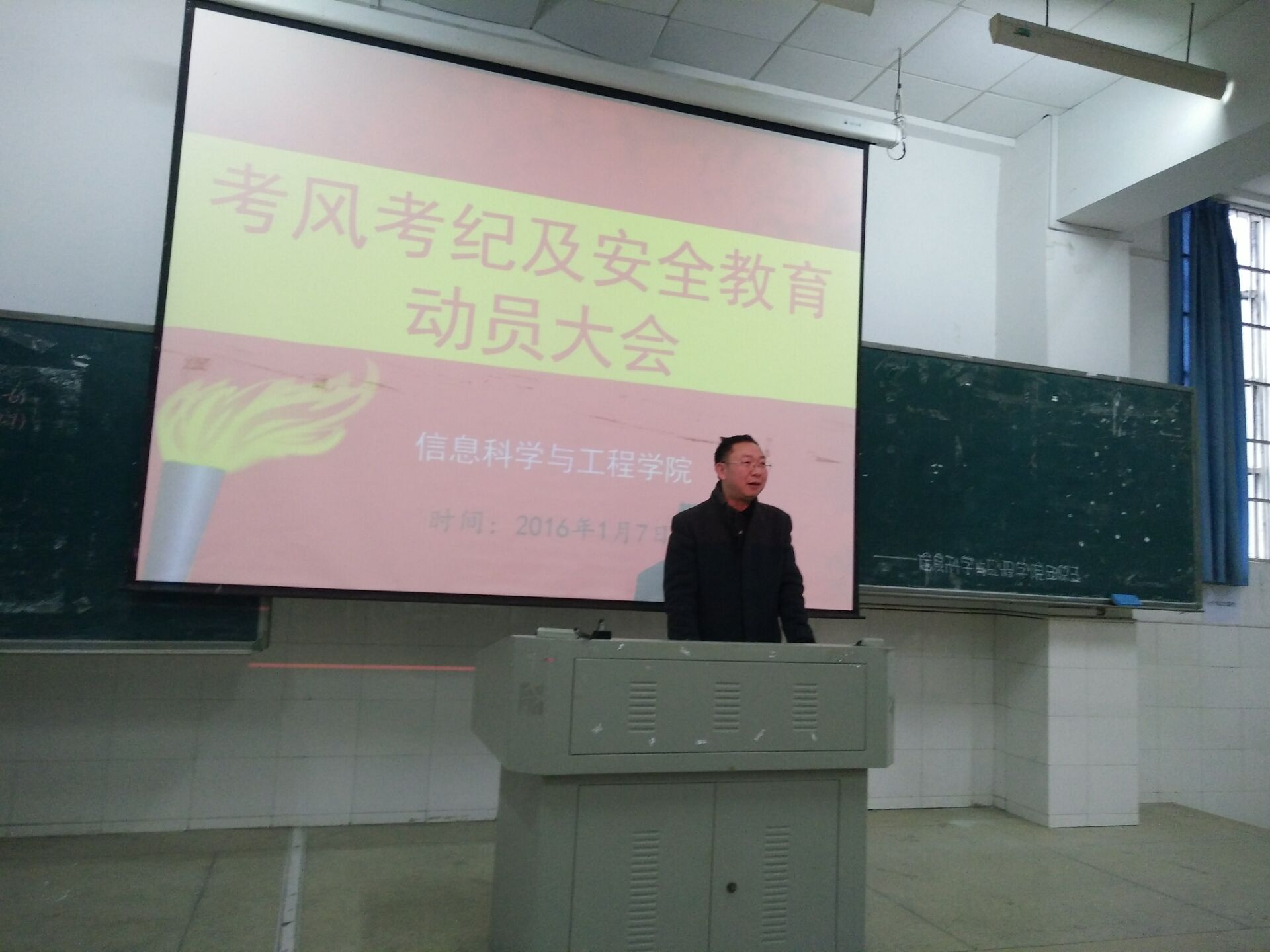 (通訊員 肖亞麗 易利)2016年1月7日中午12點30分,信息科學與工程與學院考風考紀及安全教育動員大會在實驗樓C棟101教室隆重舉行。信息科學與工程學院黨總支書記王杰文、黨總支副書記羅祥云、副院長田祖?zhèn)ァ⒃簣F總支書記易利、院學工辦關紅儒老師、李豪杰老師、院學生干部、各班班干部代表及我院各班級寢室長共計400余人參加了本次大會。本次會議由易利主持。