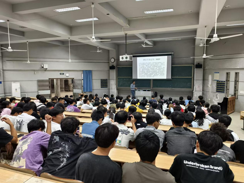 周聰詳細介紹了網(wǎng)絡空間安全專業(yè)的重要性和廣闊前景。他指出,在當今數(shù)字化時代,網(wǎng)絡空間安全已成為國家安全的重要組成部分,無論是企業(yè)還是政府機構,都對網(wǎng)絡空間安全專業(yè)人才有著迫切需求。他通過生動的案例和數(shù)據(jù),讓新生們深刻認識到自己所學專業(yè)的價值和責任。隨后,他就專業(yè)課程設置、教學方法和實踐教學環(huán)節(jié)進行了深入講解。他強調,網(wǎng)絡安全專業(yè)不僅注重理論知識的學習,更強調實踐操作能力的培養(yǎng)。學校正在籌建網(wǎng)絡安全實驗室、密碼學實驗室,為同學們提供了豐富的實踐機會,讓大家在實踐中不斷提升自己的專業(yè)技能。