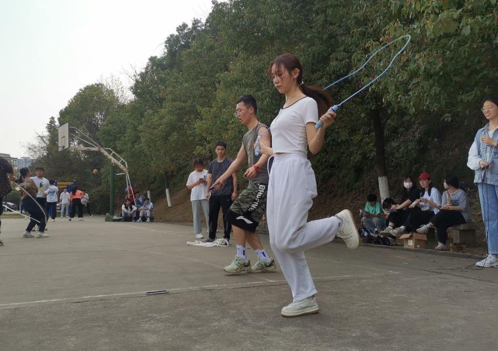 隨著一聲令下,單人一分鐘跳繩比賽正式開始了。在比賽中,參賽的同學(xué)們在場上跳躍著,揮動著雙臂,腳掌與地面的摩擦聲譜出一曲動聽的樂章,手中的跳繩在空中舞出一條優(yōu)美的弧線。場下的同學(xué)們都為他們吶喊加油,臉上洋溢著燦爛的笑容,籃球場變得尤為熱鬧。最終,21級881教技班龍宇馨同學(xué)以一分鐘200跳的絕對實(shí)力獲得女子此項(xiàng)比賽的第一名,20級849教技班肖裕鑫同學(xué)以一分鐘209跳獲得男子此項(xiàng)比賽的第一名。