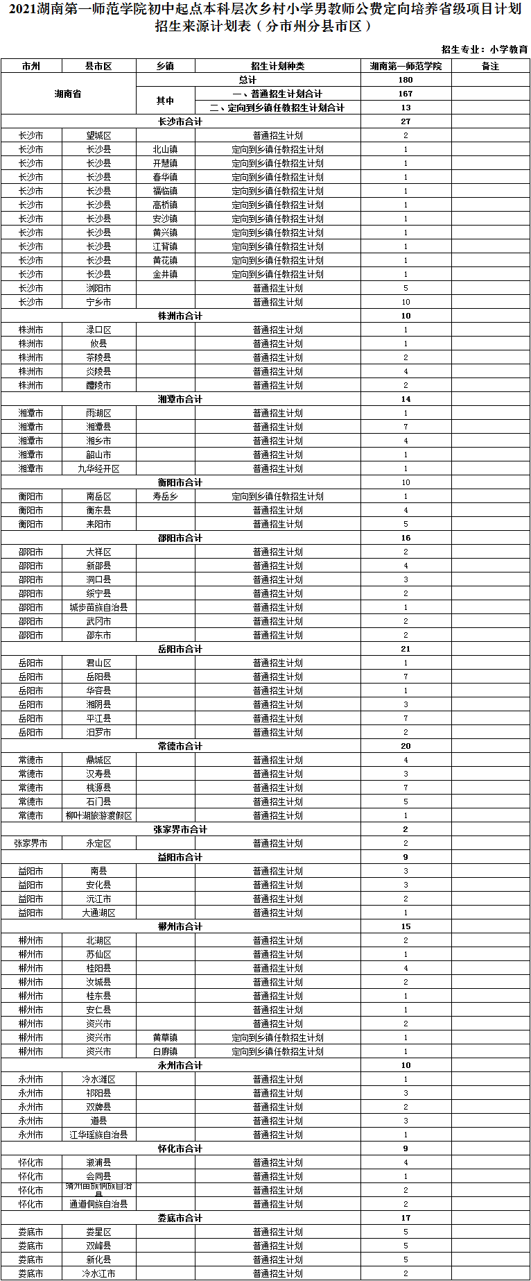 附件2 2021年湖南第一師范學院初中起點本科層次鄉(xiāng)村小學教師公費定向培養(yǎng)省級項目計劃招生來源計劃表(分市州分縣市區(qū)分專業(yè)).png
