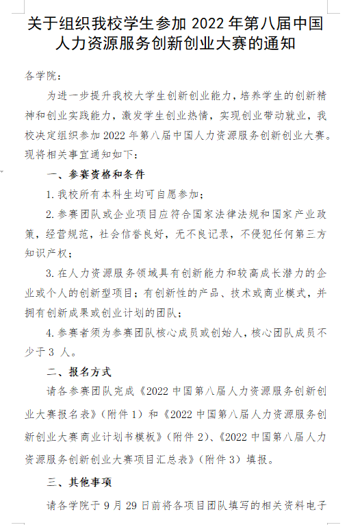 現(xiàn)將校創(chuàng)新創(chuàng)業(yè)學(xué)院《關(guān)于組織我校學(xué)生參加2022年第八屆中國(guó)人力資源服務(wù)創(chuàng)新創(chuàng)業(yè)大賽的通知》轉(zhuǎn)發(fā),請(qǐng)按照文件要求,廣泛宣傳,積極動(dòng)員學(xué)生參加大賽,具體參賽要求見附件?。請(qǐng)各班實(shí)踐委員于9月27日下午18:00前將推報(bào)材料(見附件1)紙質(zhì)版、電子版以班級(jí)名稱命名上交院創(chuàng)新創(chuàng)業(yè)與就業(yè)服務(wù)部楊同學(xué)(QQ:2084222961)。院創(chuàng)新創(chuàng)業(yè)與就業(yè)服務(wù)部于次日交至學(xué)院學(xué)工辦(百熙樓127-5)。