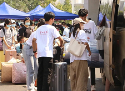 圖為迎新志愿者引導新生上校園擺渡車,幫助新生搬運行李箱送至寢室